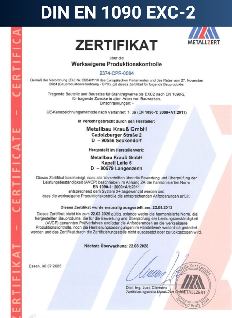 Wir sind nach DIN EN 1090 EXC-2 zertifiziert und dürfen daher statisch beanspruchte Bauteile für den privaten und öffentlichen Bereich herstellen.